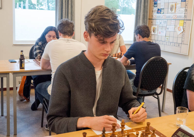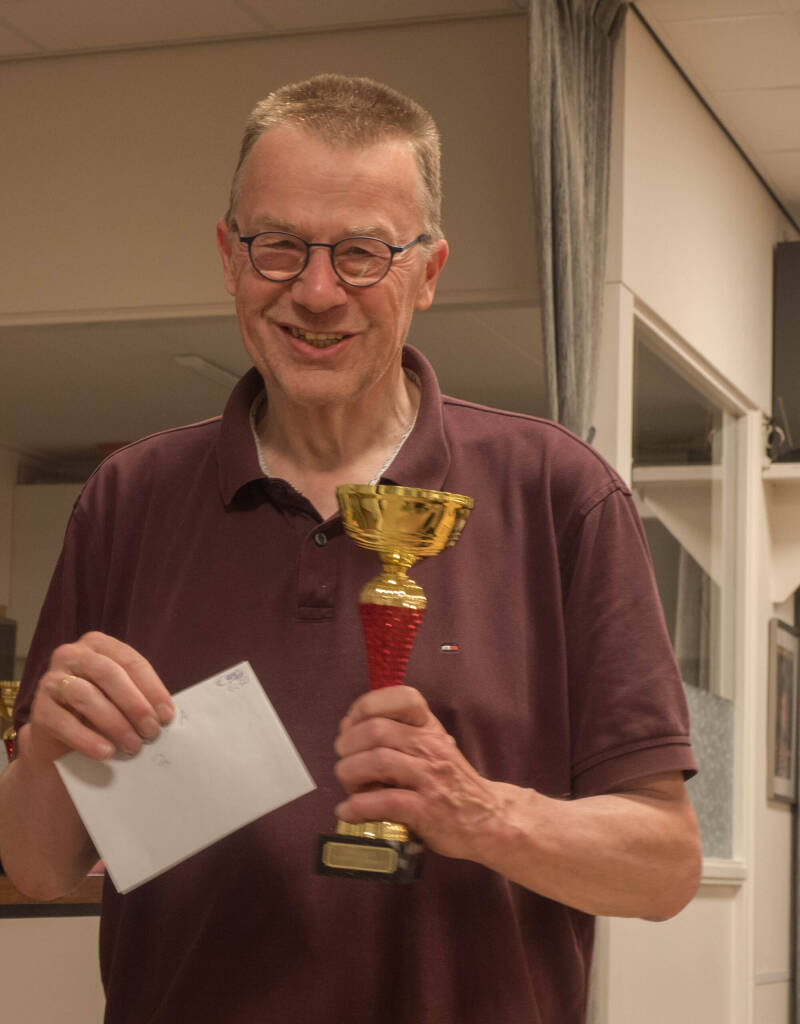 Oscar Koppenens was al getipt, maar zou hij het ook redden? Ja; hij ging snel van start aan bord 12 tegen Jordi de Jong. Na 10 zetten had hij nog steeds 1½ uur op zijn klok staan en hij liep ook af en toe rond. Hij was blijkbaar zeker van zijn zaak. En terecht, want hij won zijn partij. Hij behaalde zo in dit toernooi maar liefst 4½ punt. Dat lukte ook bij André van Wingerden, Joost Stoker en Xander Prijs, maar door het systeem van weerstandspunten mocht Oscar de 1ste prijs in ontvangst nemen. Een mooie bekroning!