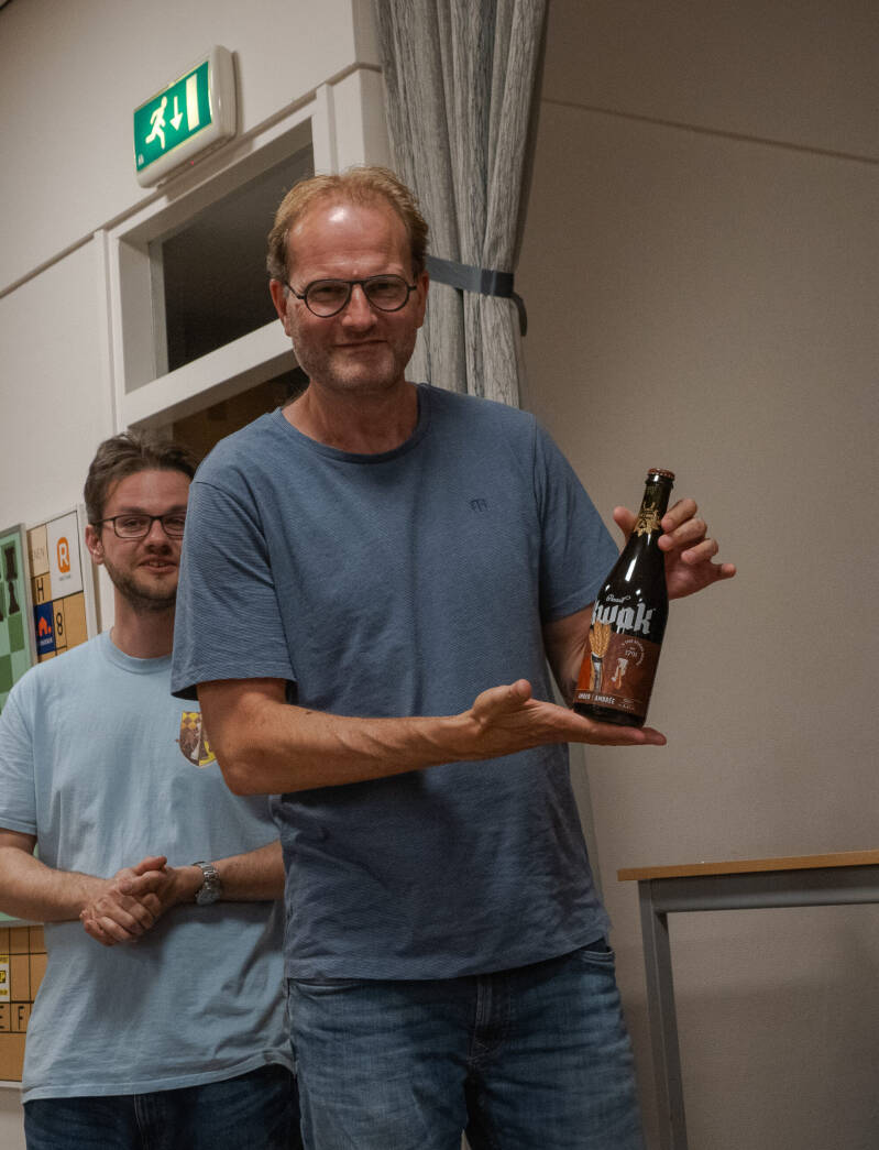 Gelukkig waren er behalve de bekers veel prijzen. Want in categorie C waren er maar liefst zes personen die 3 punten behaalde. Op basis van de regels stond Gerrit de Jong daarvan bovenaan en haalde de derde prijs in categorie C, maar we hebben uiteraard ook de andere vijf in het zonnetje gezet en naar voren geroepen voor een prijs. Voor zover ze (nog) aanwezig waren. Uiteindelijk stonden ze volgens de regels op de plaatsen 4, 5, 6, 7 en 8. Het waren Ben Koppenens, de vader van Oscar Koppenens uit categorie A, onze voorzitter Marcel Klein, Paul Schakel, Joeri Smits en Sertaç Oruç. Gefeliciteerd mannen!