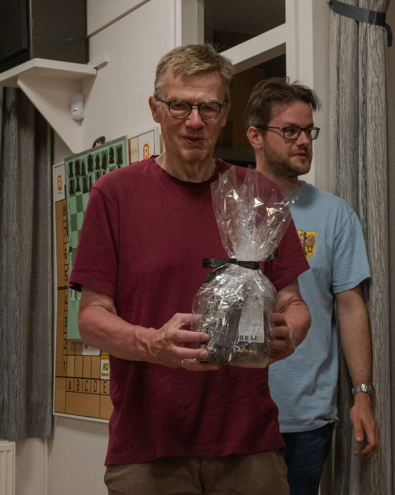 Uiteraard ontvingen de nummers 1, 2 en 3 van elke categorie een prijs en een beker. Maar er werden ook andere prijzen uitgedeeld voor bijzondere situaties. De laatste die zo’n prijs kreeg was Tom van Lopik. Ondanks dat hij wit had aan bord 29 zat het hem niet mee in de zevende en laatste ronde. Was de opening van zijn tegenstander te ingewikkeld? Hij overzag de principes in elk geval niet. Al op de 8ste en 9de zet maakte hij fouten en kwam daardoor materiaal achter te staan en rokeerde ook nog kort terwijl zijn tegenstander die nog niet gerokeerd had ook nog een open h-lijn had. Hij probeerde wel zijn stukken te verdedigen, maar zijn tegenstander was in de eerste plaats uit op mat. En dat lukte, zodat hij tot zijn verrassing al op de 17de zet mat gezet werd. Alleen Cees Moes en Daan Stuij aan bord 30 waren eerder klaar. En ook Daan werd naar voren geroepen voor een prijs. Hij verdubbelde in de laatste ronde zijn punten van 1 naar 2.