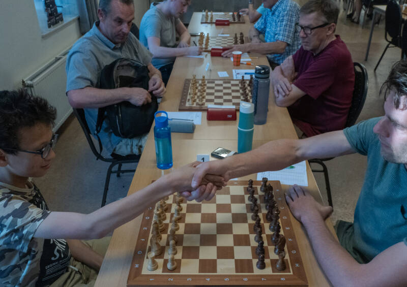 Het leek in het middenspel of Oscar er iets beter voorstond dan Peter. Oscar koos ook voor de aanval en Peter koos er niet voor om een pion op de 7de rij te verdedigen tegen een paard van Oscar, maar liet die pion gewoon slaan, maar zorgde er wel voor, dat hij even later hetzelfde kon doen bij Oscar. Na het afruilen van de paarden hadden ze allebei nog 2 torens en 5 pionnen en de pionnen ook nog op dezelfde lijnen. Bij mij staan toren- en pionnen eindspelen als de moeilijkste bekend. Ze kozen er voor om de Torens af te ruilen en hadden toen allebei nog 5 pionnen op de vleugels. Maar Peter was met zijn Koning een zet eerder in het centrum en had zijn h-pion nog niet gespeeld. Die hield hij achter de hand voor als hij een tempootje nodig had. En dan merk je, dat iemand als Peter gewoon veel meer ervaring heeft met dit soort eindspelen als de jonge Oscar. Hij gebruikte ook ruim zijn tijd, omdat hij wilde weten wat Oscar allemaal zou kunnen doen, maar vooral overdacht hij wat Oscar waarschijnlijk zou doen. En dat gebeurde en Peter profiteerde.